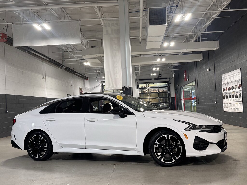Glacial White Pearl 2022 Kia K5 GT-Line AWD 8-Speed Automatic I4 1 OWNER CERTIFED CARFAX**, **LEATHER HEATED SEATS**, **ALLOY WHEELS**, **BACK UP CAMERA**, **NAVIGATION **, **ALL WHEEL DRIVE**, **PREMIUM SOUND SYSTEM**, **NON SMOKER**, **LOCAL TRADE IN**, **SUNROOF/MOONROOF**, **BLUE TOOTH/ HANDS FREE**, **I POD CONNECT**, Apple CarPlay & Android Auto, Automatic temperature control, Forward Collision Avoidance-Assist - Cyclist, Forward Collision Avoidance-Assist - Junction Turn, Front dual zone A/C, Front fog lights, Gloss Black Pillar & Door Frame Cover, GT-Line AWD Premium Package, GT-Line Red Interior Package, Heated Steering Wheel, Highway Driving Assist, LED Interior Lighting, LED Projection Headlights, Navigation-Based Smart Cruise Control - Curve, Panoramic Sunroof, Power driver seat, Smart Cruise Control w/Stop & Go.