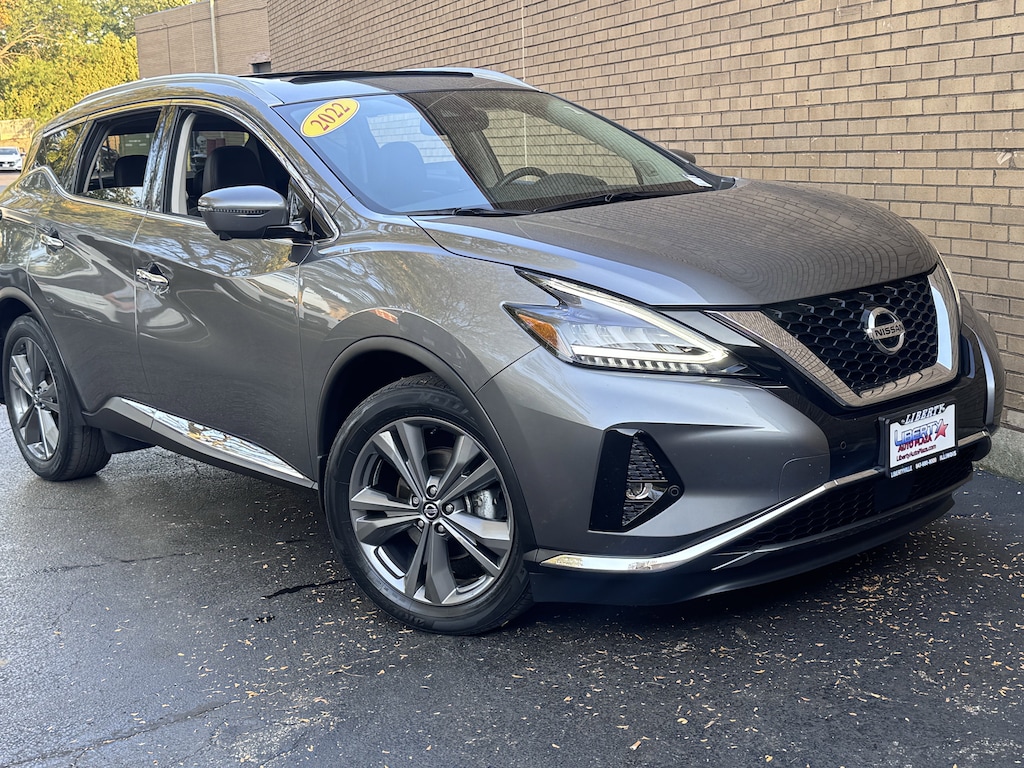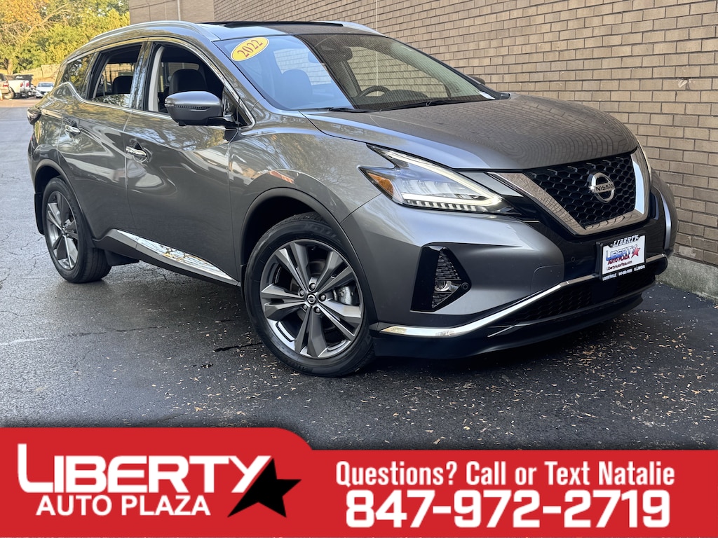 Gun Metallic 2022 Nissan Murano Platinum AWD CVT with Xtronic 3.5L V6 DOHC 24V 1 OWNER CERTIFED CARFAX**, **LEATHER HEATED SEATS**, **ALLOY WHEELS**, **BACK UP CAMERA**, **NAVIGATION **, **CLEAN CERTIFIED CARFAX**, **ALL WHEEL DRIVE**, **PREMIUM SOUND SYSTEM**, **NON SMOKER**, **LOCAL TRADE IN**, **SUNROOF/MOONROOF**, **BLUE TOOTH/ HANDS FREE**, **I POD CONNECT**, HEATED AND COOLED FRONT SEATS, CVT with Xtronic, AWD, 11 Speakers, AM/FM/CD/MP3/WMA Audio System, Auto tilt-away steering wheel, Auto-dimming Rear-View mirror, Automatic temperature control, Emergency communication system: NissanConnect Services (first 6 months included), Front dual zone A/C, Front fog lights, Heated rear seats, Memory seat, NissanConnect featuring Apple CarPlay and Android Auto, NissanConnect Services Powered By SiriusXM, Power driver seat, Power Liftgate, Power passenger seat, Premium audio system: Bose, Wheels: 20" Unique Dark Hyper Silver.